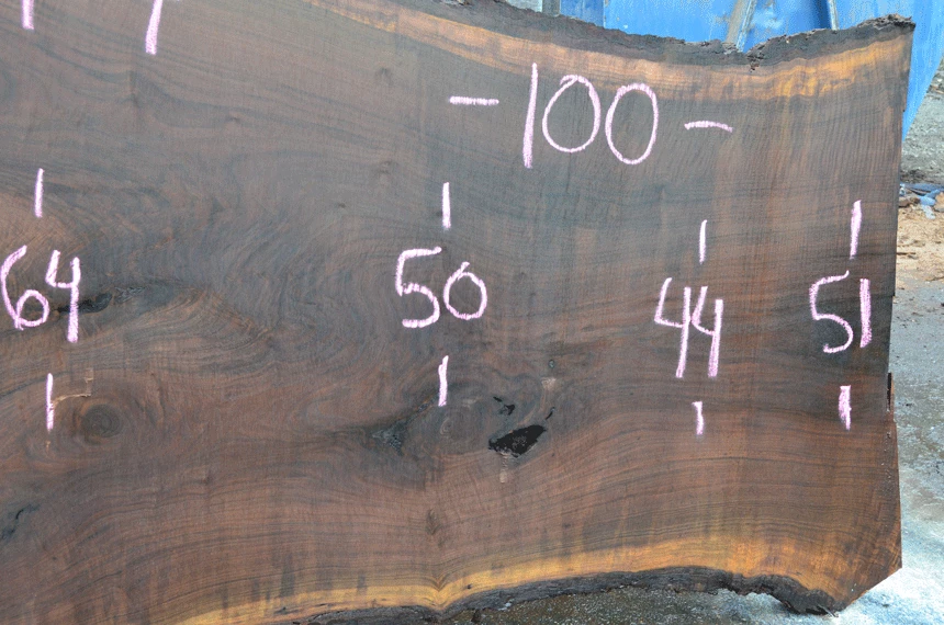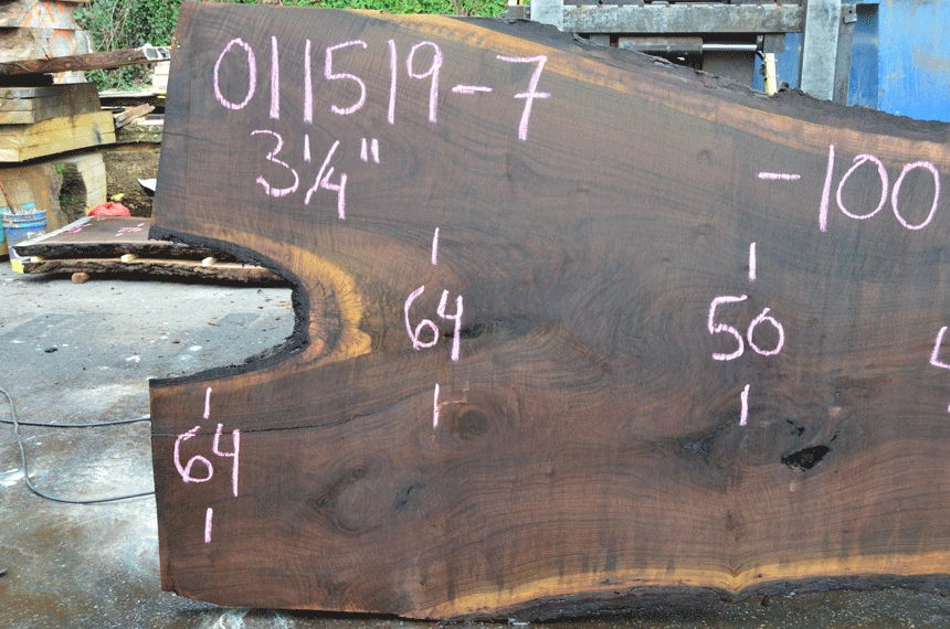 Cracks left, Bark inclusions, Rot spot right of center, Sound knots, Small chainsaw miscut top right edge, Figure