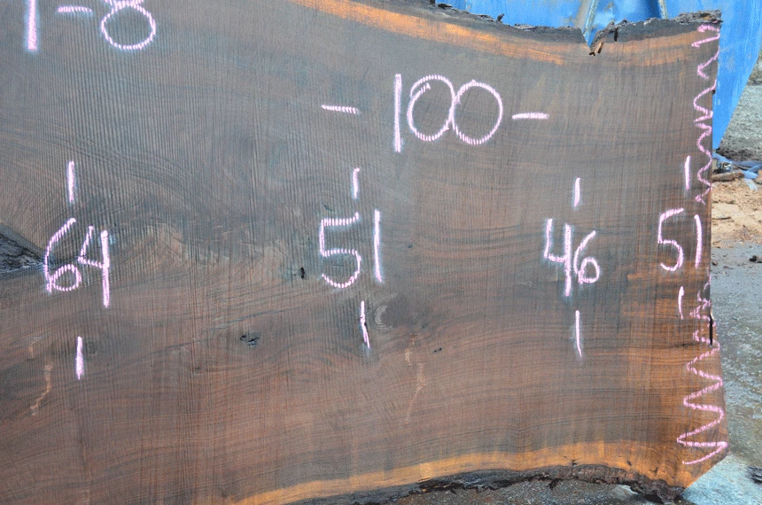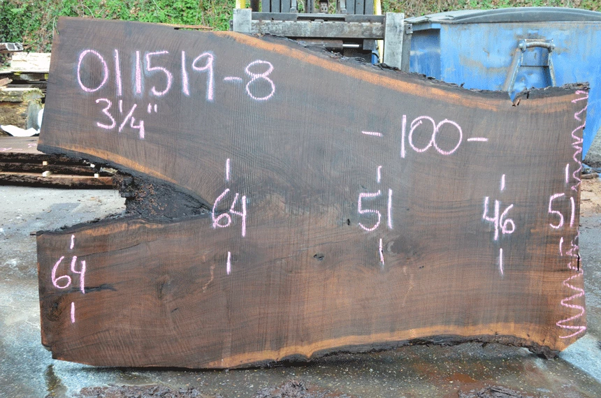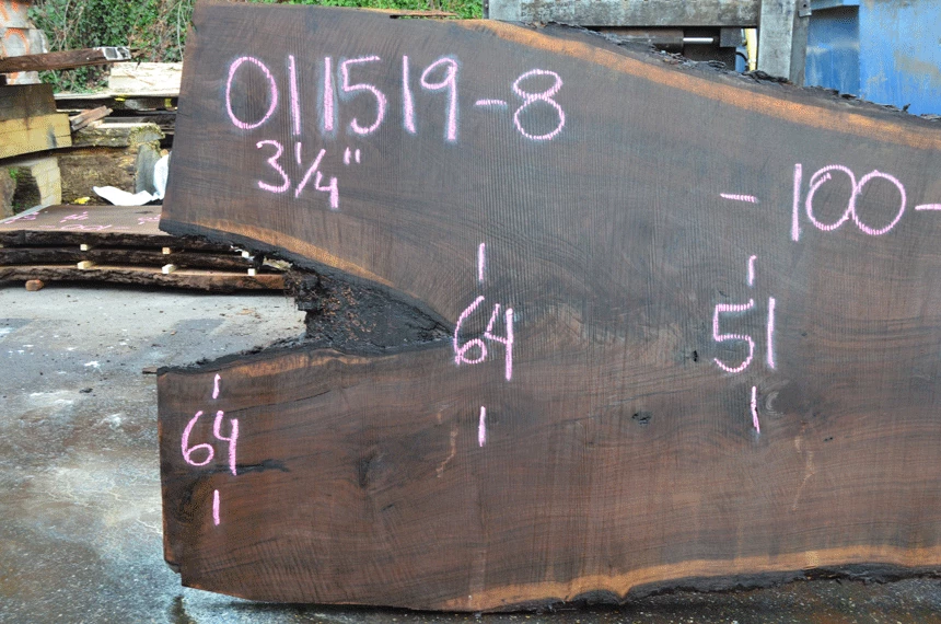 Cracks left, Bark inclusion, Sound knots, Chainsaw miscut top right edge, Thins to 2.75″ last 3-5″ on right, Figure