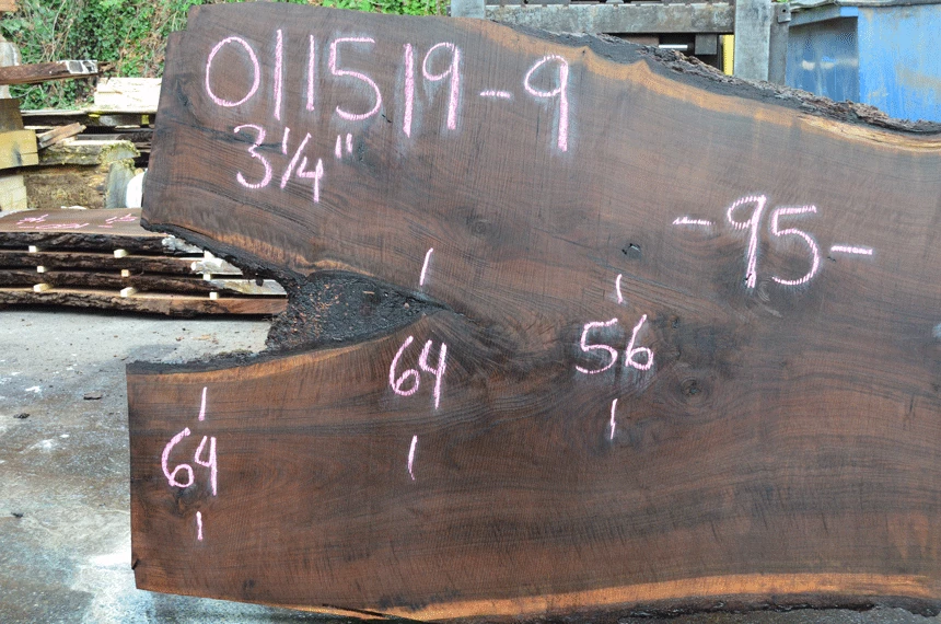 Cracks left, Bark inclusions, Sound knots, Figure, Chainsaw miscut bottom right