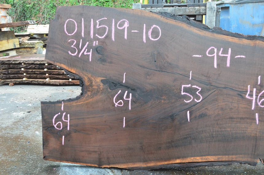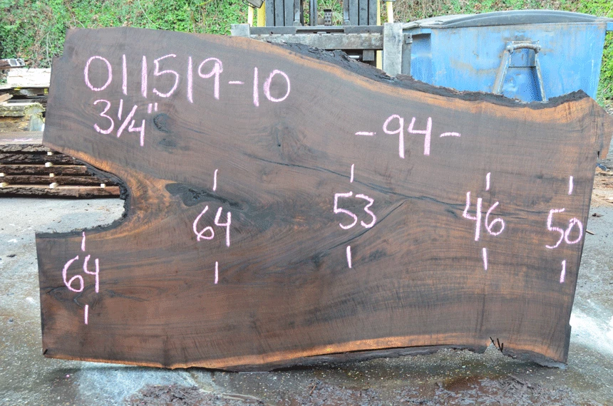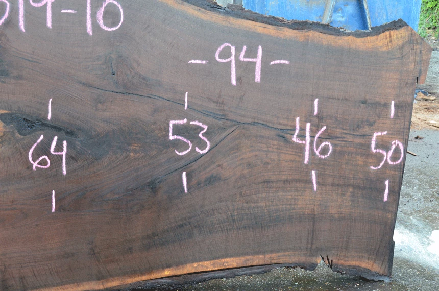 Cracks left, Bark inclusions, Sound knots, Figure, Chainsaw miscut bottom right