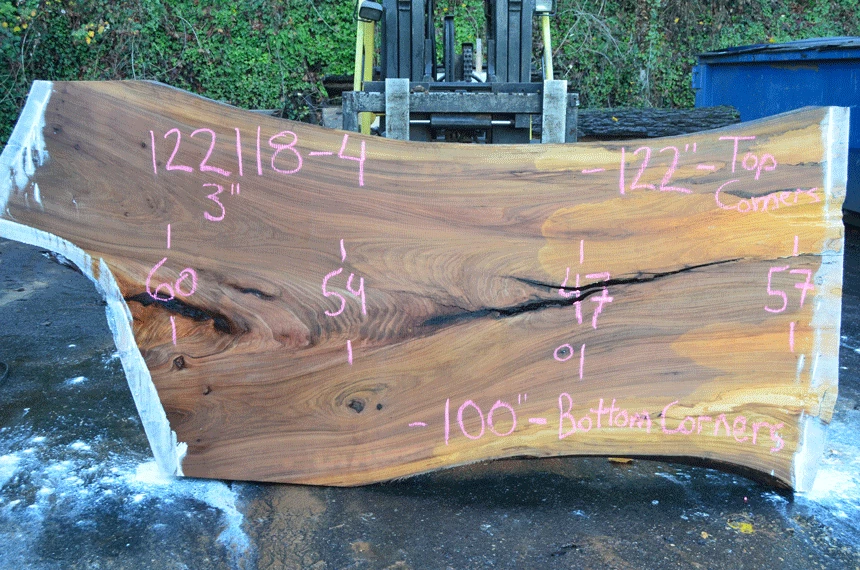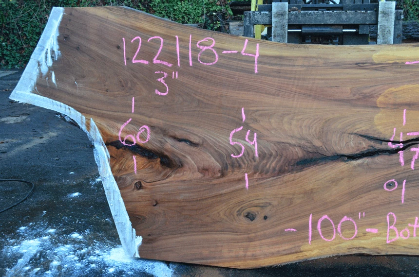 Bark inclusions, Sound knots, Crack right, Spalting and rot top right, Nail center, Feather crotch