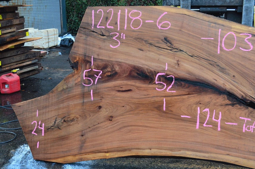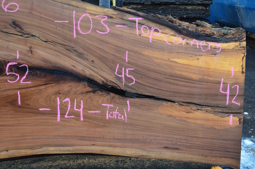Cracked knots left, Cracks, Bark inclusions, Hole right of center, Spalting rot right, Slight feather