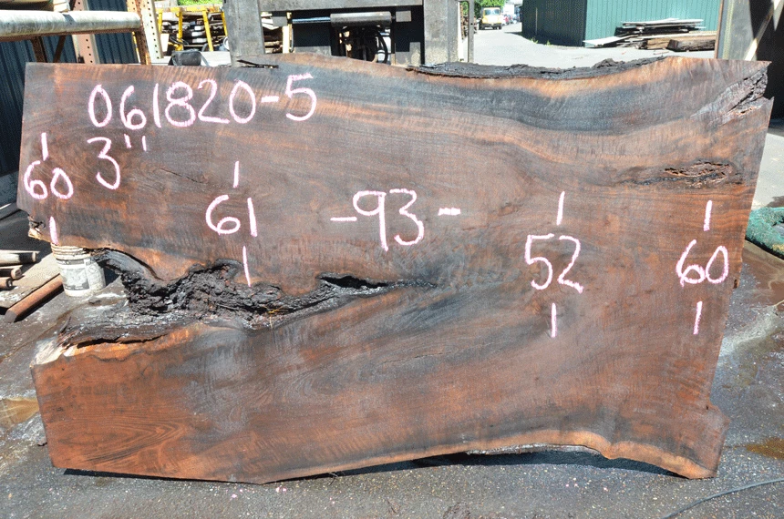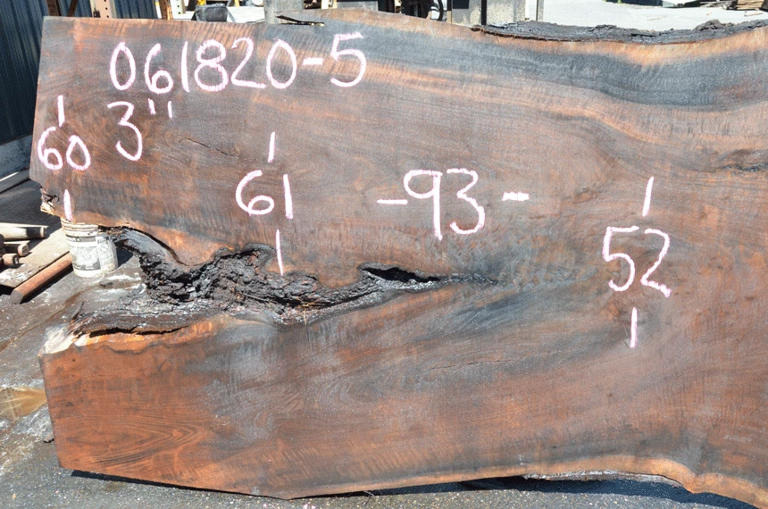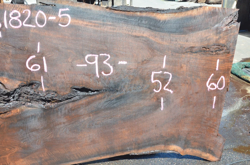 Bark inclusions, Cracks, Small Sound knots, Rot hole top right, Light figure, Small piece of metal center