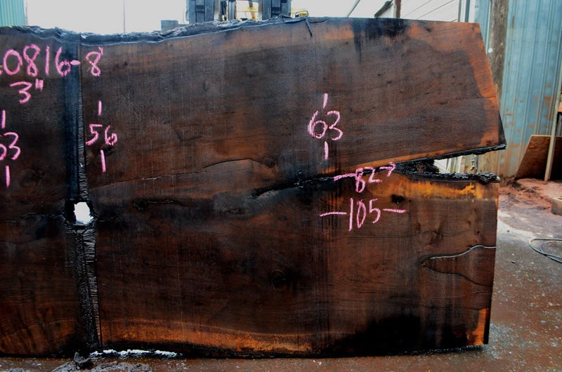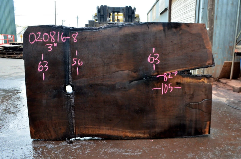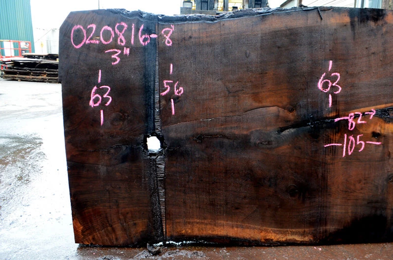 Miscut, Large hole center left, Cracks center & right, Light figure, Bark inclusion at crotch center right, Knots at center