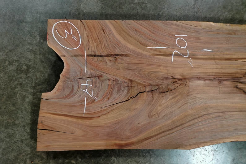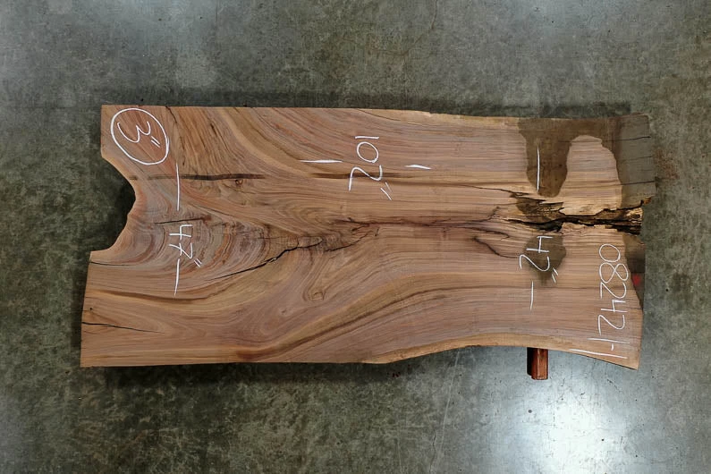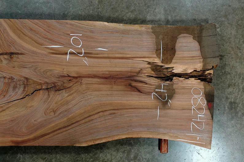 Lots of color, Marbled grain, Feathercrotch, Big crack in middle, Checking, Twist