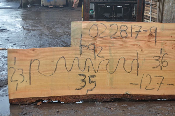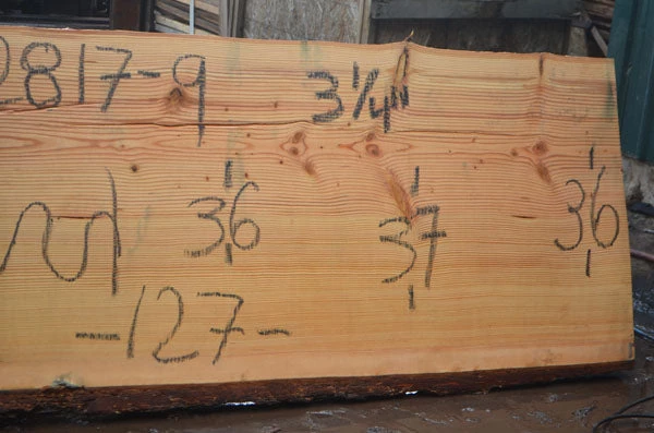 Extreme miscut- thickness decreases from 3.25″ to around 1″ almost all the way through, Cracks left to right, Knots throughout, Top left corner detached due to miscut