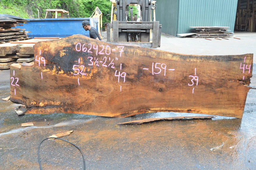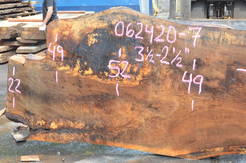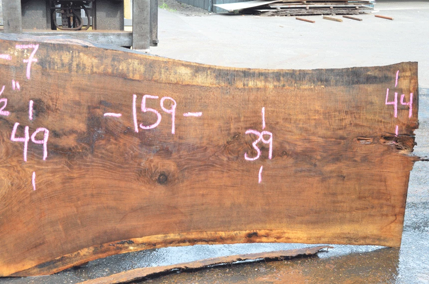 Bark inclusions left, Small cracks, Sound knots, Rot spot right end, Large rot spot left area, Slab tapers