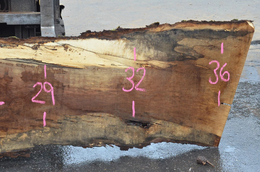 Large partially cracked knot left, Slightly rotten spot top center, Rot spot top left, Rot spot bottom right, Jacket cut