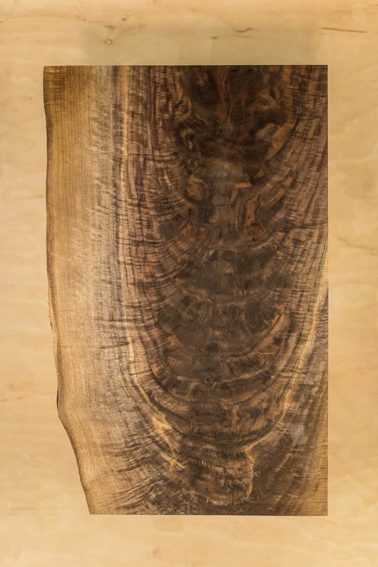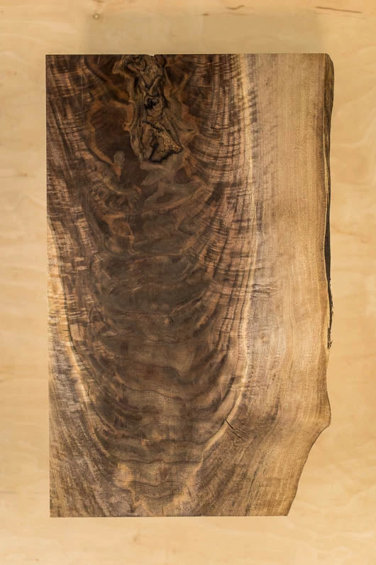 Feathercrotch figure and grain, Small cracks, Bark inclusions, Live edge, Sap, 4A