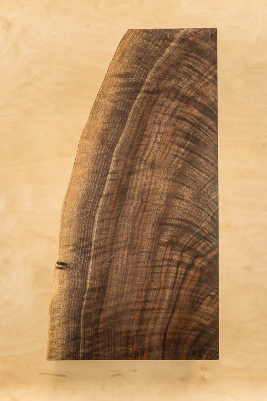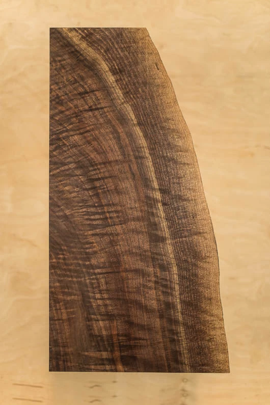 Feathercrotch figure, Curly, Quarter sawn, Live edge, Dark sap, Bug damage, 4A