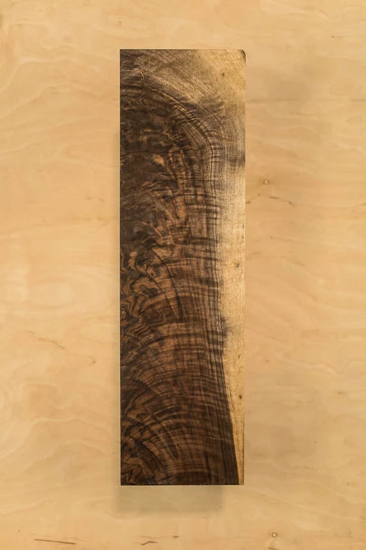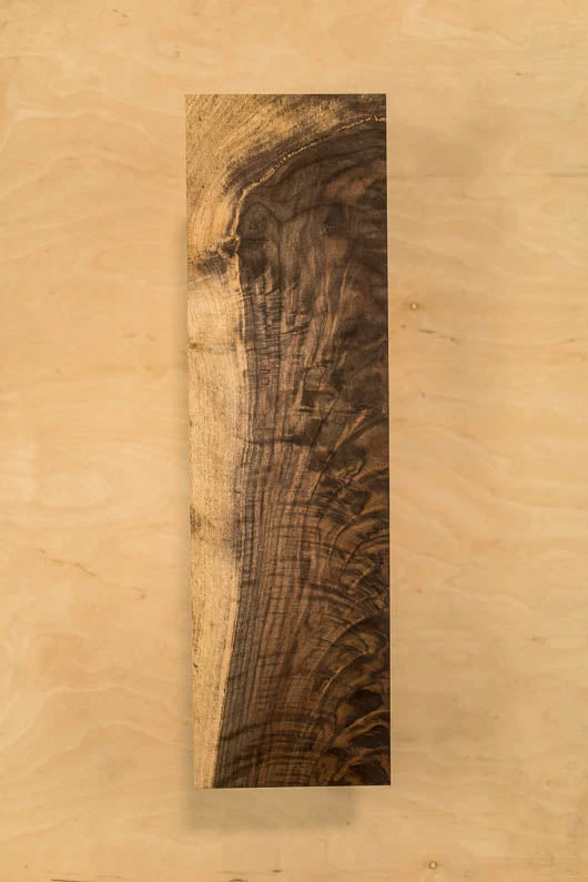Feathercrotch figure and grain, Sap, Hairline crack on each face, Bark inclusion on edge, 4A