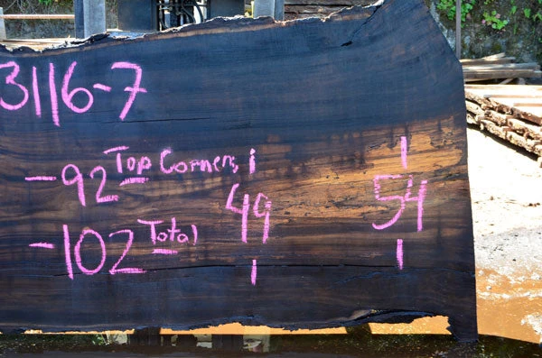 Cracks mostly on bottom, Some cracks top, Rot top left, Rot right, Sound knot left, Bark inclusion top right, Curl