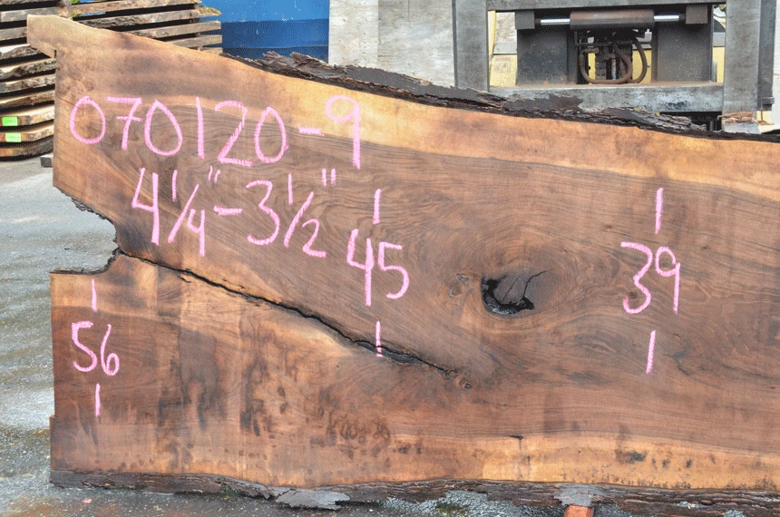 Large bark inclusion – crack left through center, Large open knot center, Soft knot right, Two visible nails bottom