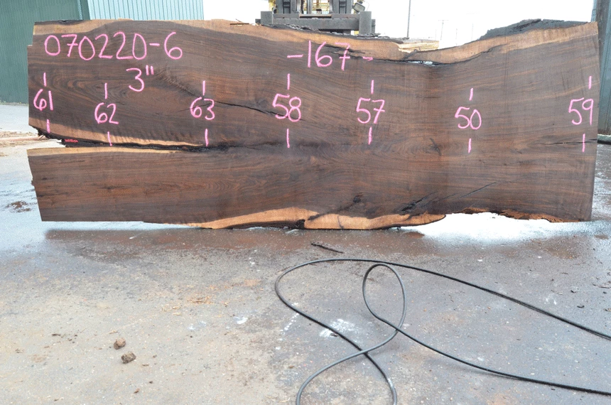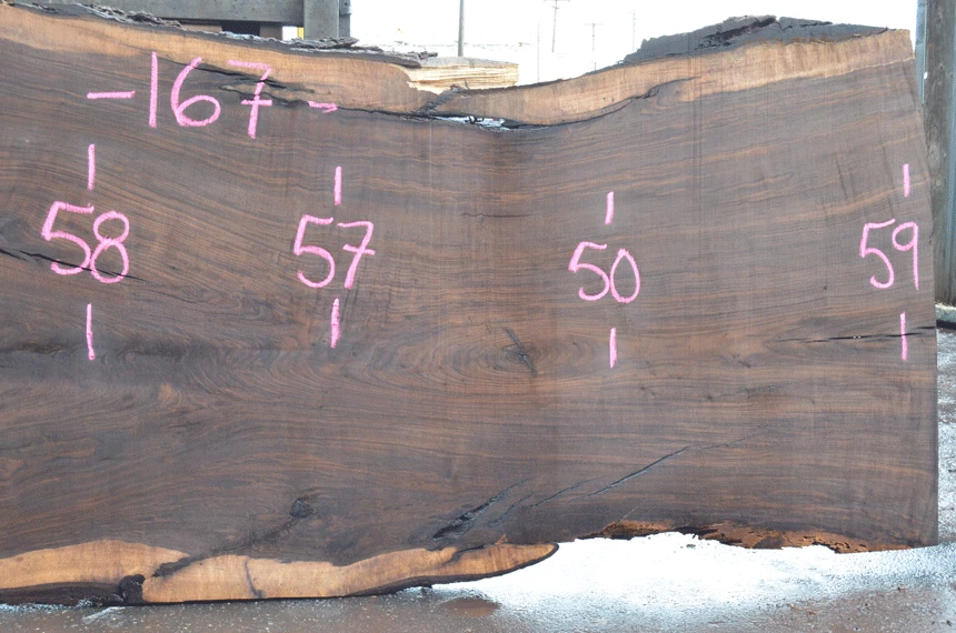 Large crack – bark inclusion left to center, Cracks bottom and top center, End checking right, Rot bottom right