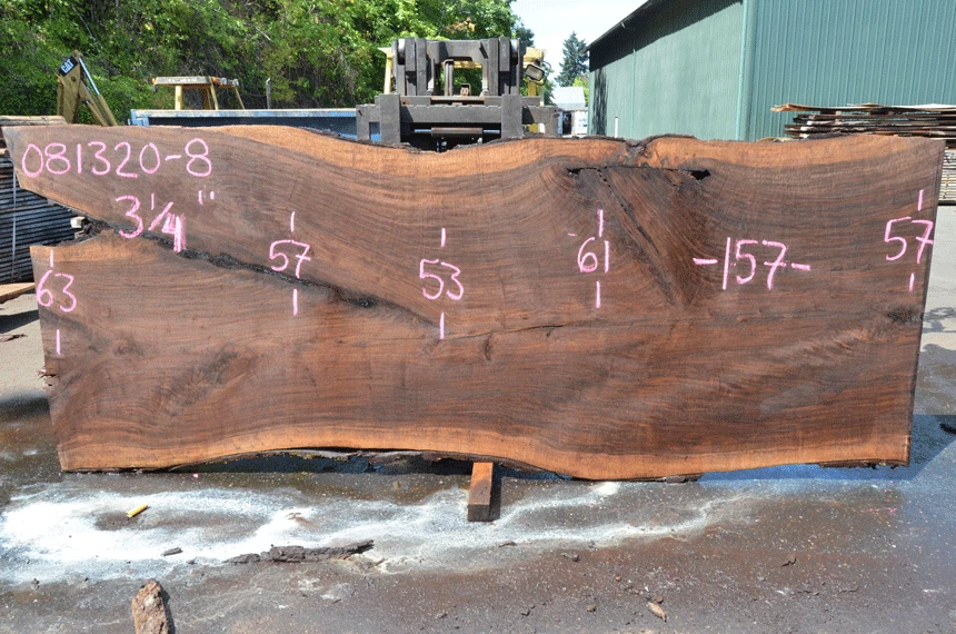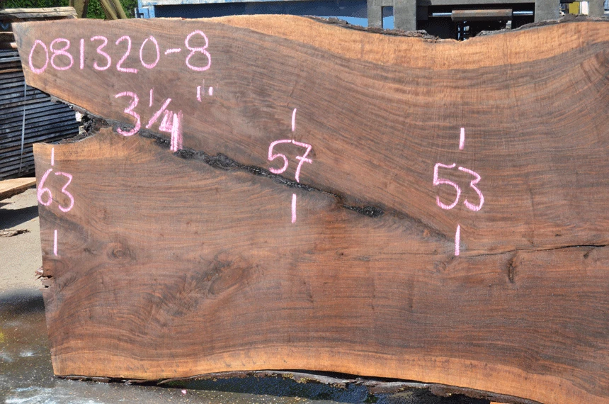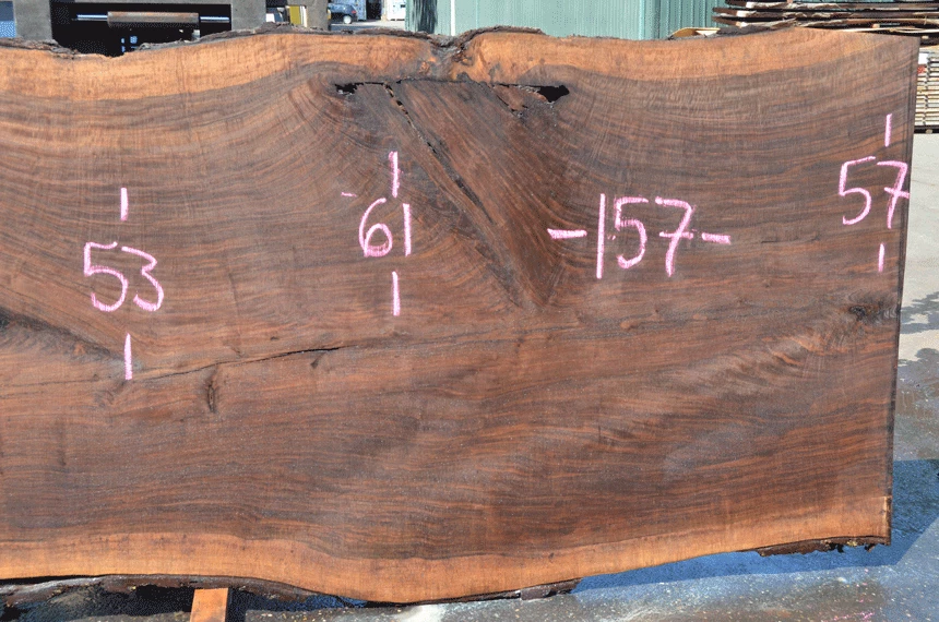 Sound knots, Bark inclusions, Figure, Small cracks center and right, Small rot holes top right, Soft knot center