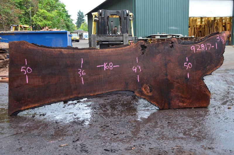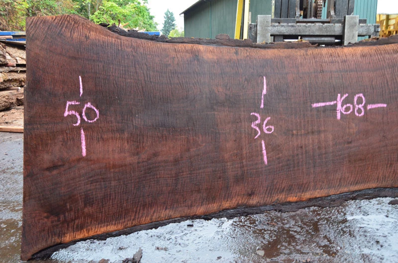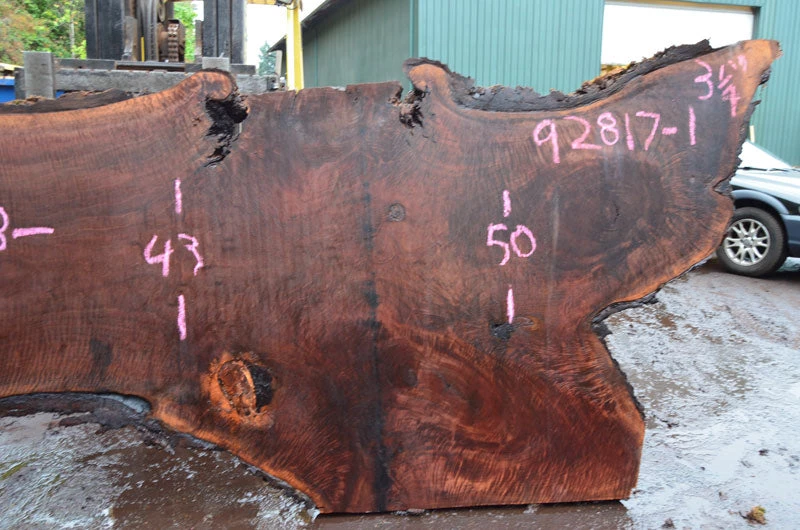 Extreme figure through out slab, Clear on left, Bark inclusion with some rot on right, Feather crotch on right, backside clear