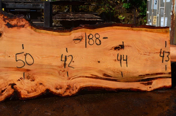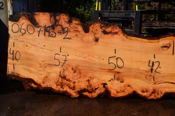 Cracks through center left, Cracked knot top left of center, Soft knot right, Small knots through center, bark inclusions,  Light figure, Burls