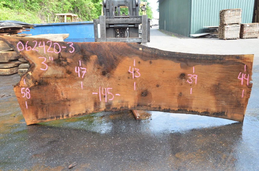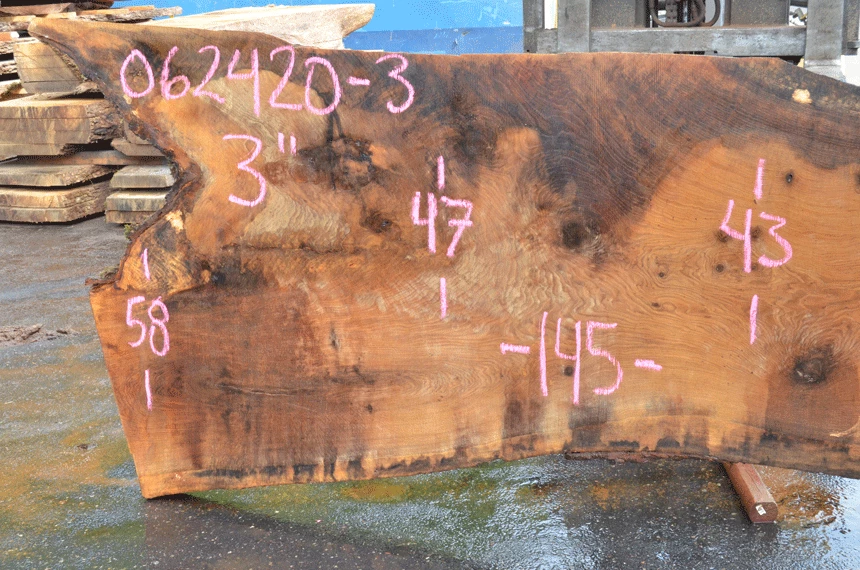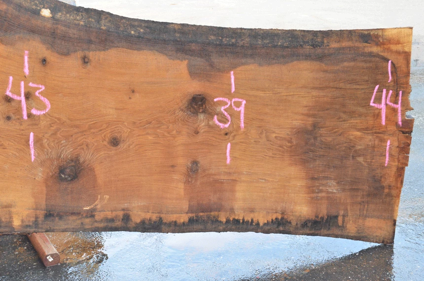 Small bark inclusions left, Small cracks in large knot bottom left, Sound knots, Several partially cracked soft knots, Small cracks far right end, Light feather crotch