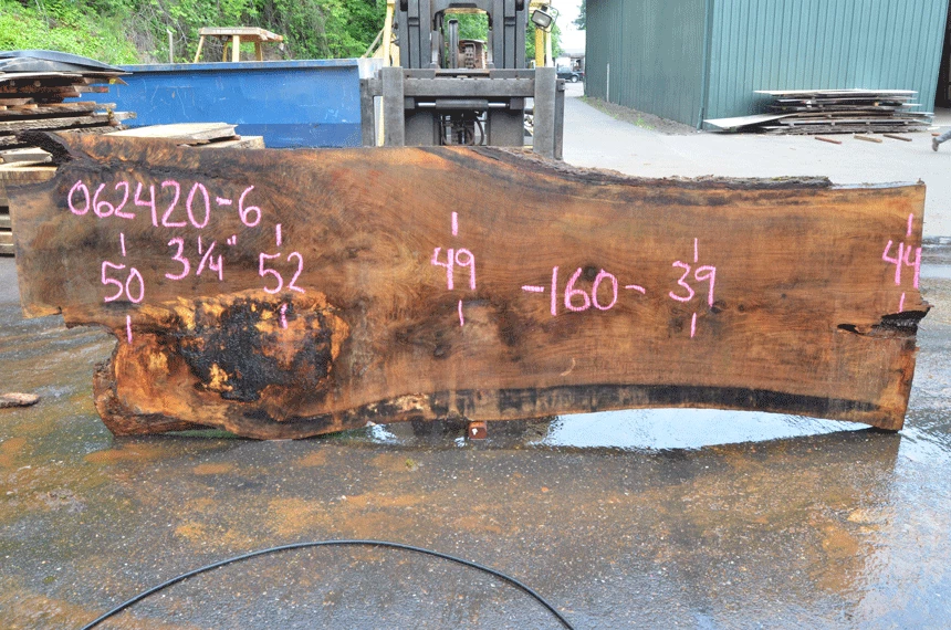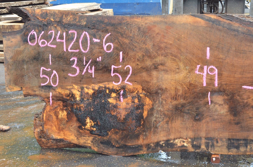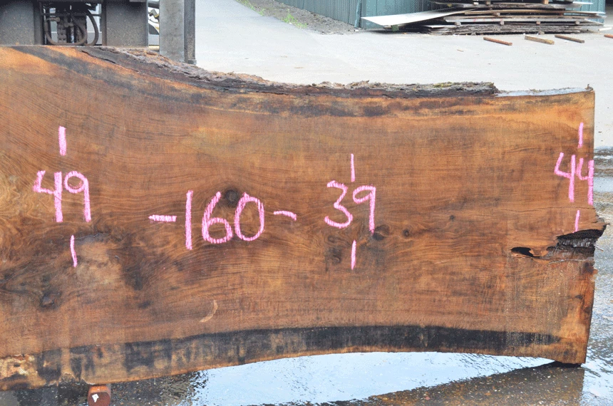 Bark inclusions left, Small crack left, Sound knots, Crack right end, Light figure, Rot spot left area