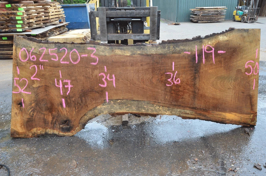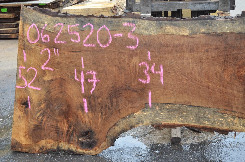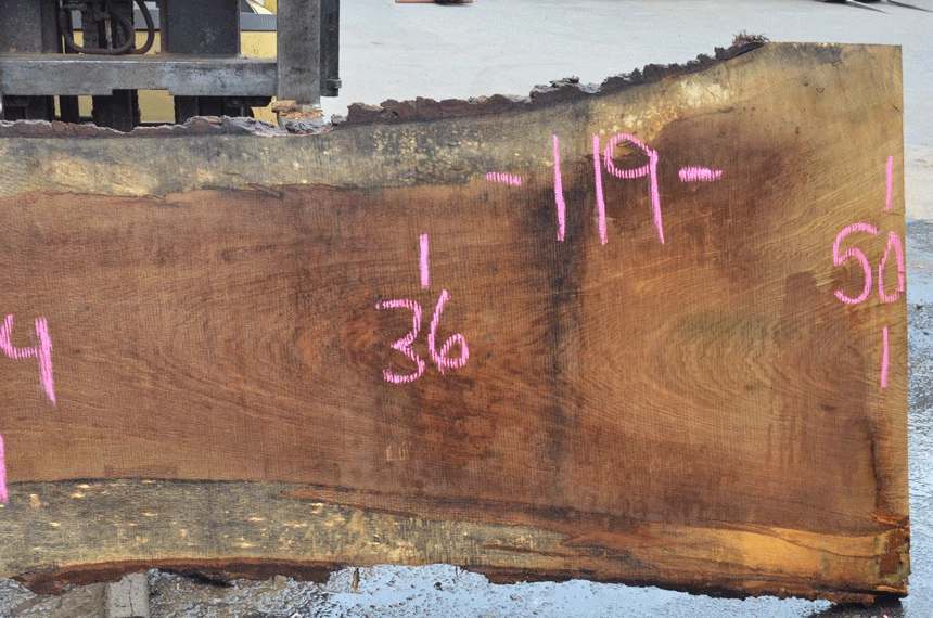 Bark inclusion left, Partially cracked knot left, Rot spot bottom left, Small cracks on right end