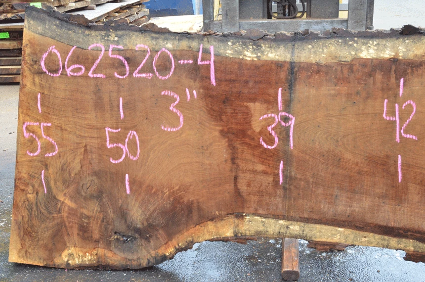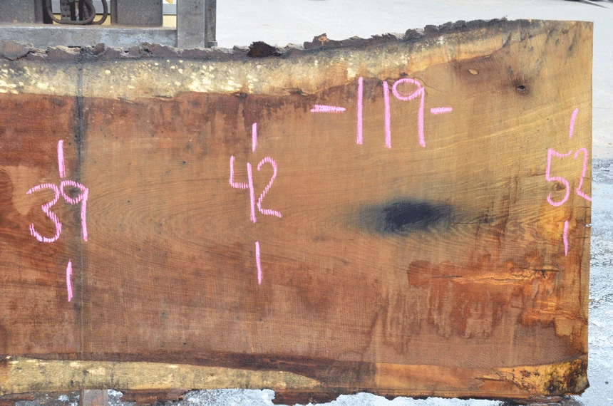 Partially cracked knot left, Small rotted hole bottom left, Small bark inclusion bottom left of center, Metal stain