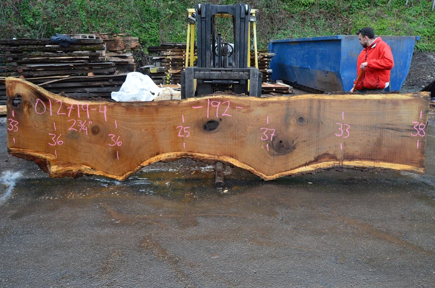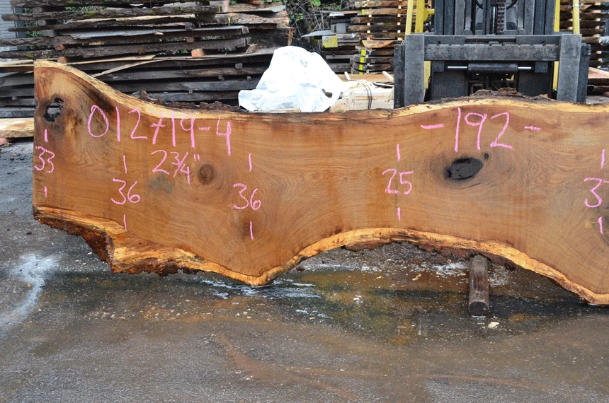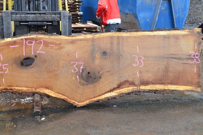 Two sound knots left, Two rotten knots, Two cracked sound knots, Cracks on ends, Small bark inclusions, Light figure