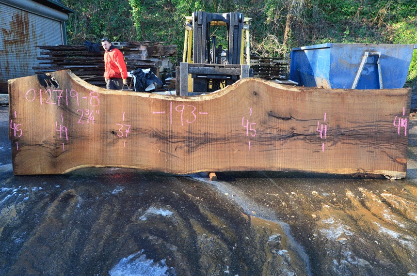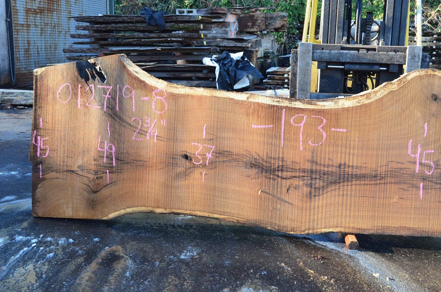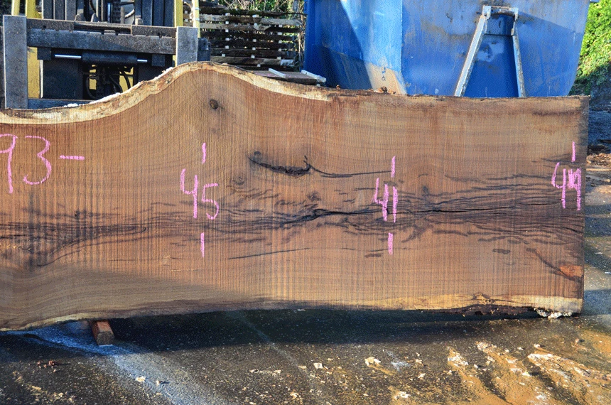 Partially rotted cracked knot top left, Wind check cracks, Larger cracks right, Soft knots, Small bark inclusions, Discoloration, Figure