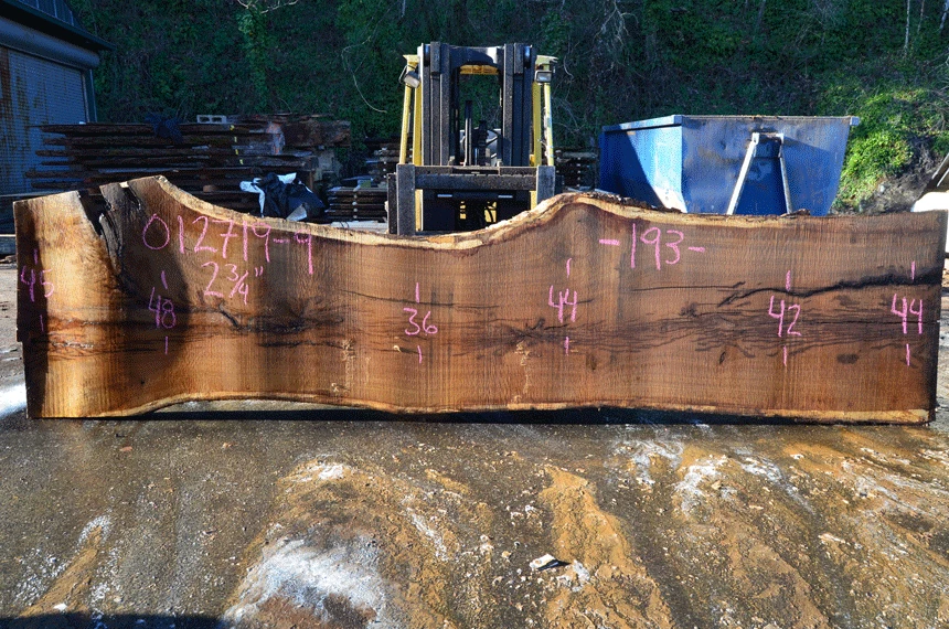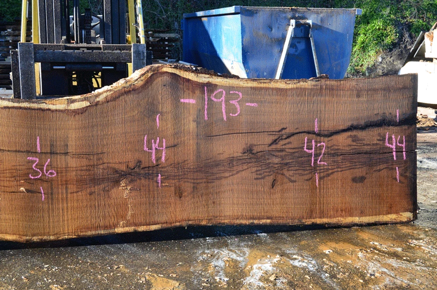 Blade wandering left down to 2.625″, Wind check cracks, Small bark inclusions, Discoloration, Larger cracks right, Light figure