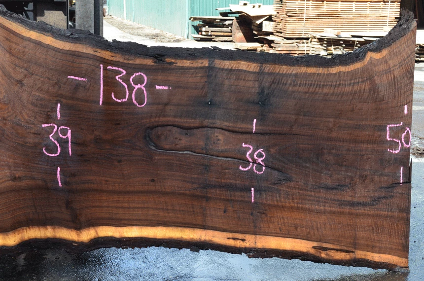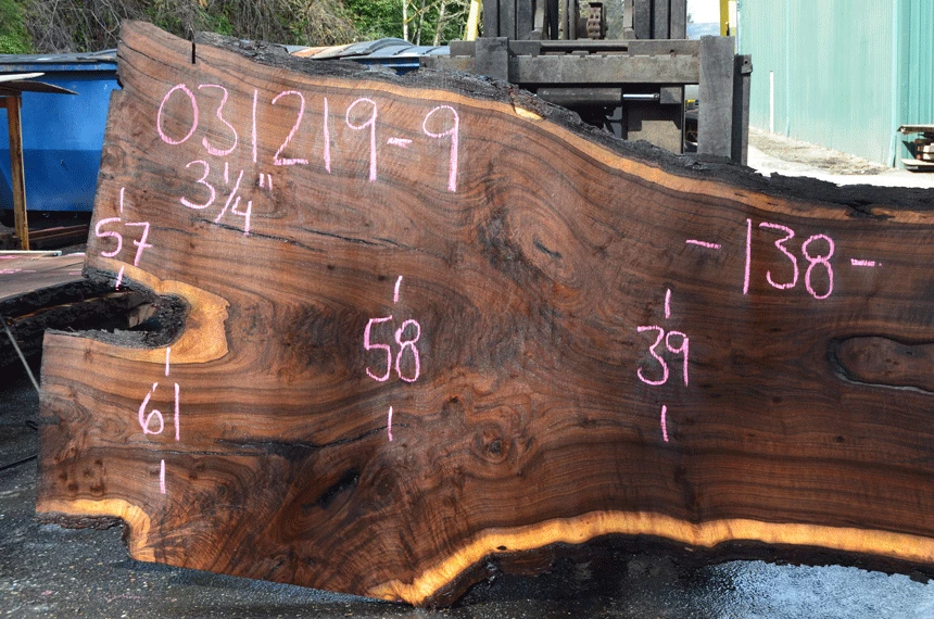 Cracks, Partially rotten knot bottom left, Miscut top left corner, Sound knots, Small bark inclusions, Two nails top right, Feather crotch, Figure