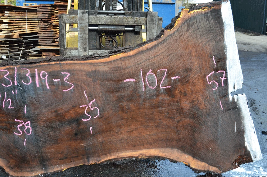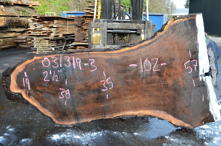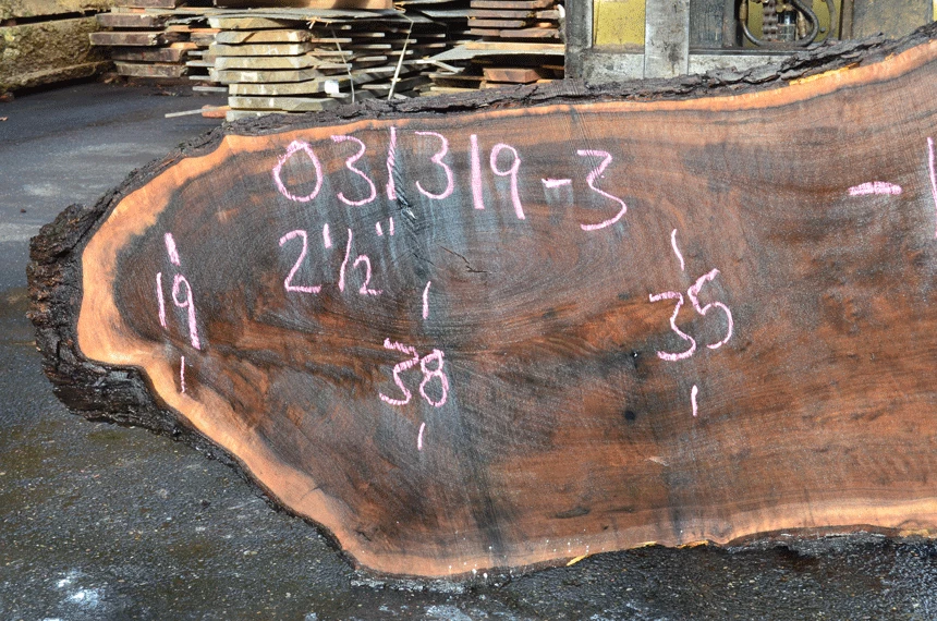 Partially cracked knot left, Nails, Bark inclusions with rot far right end, Concrete far right end, Slight blade wandering between nails 2.5″+