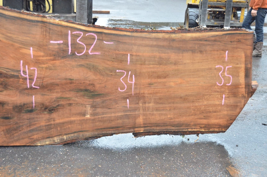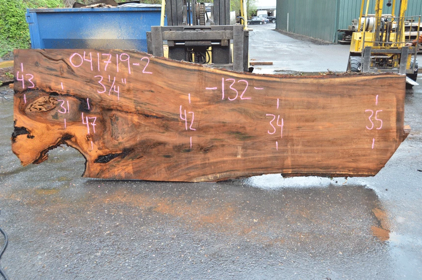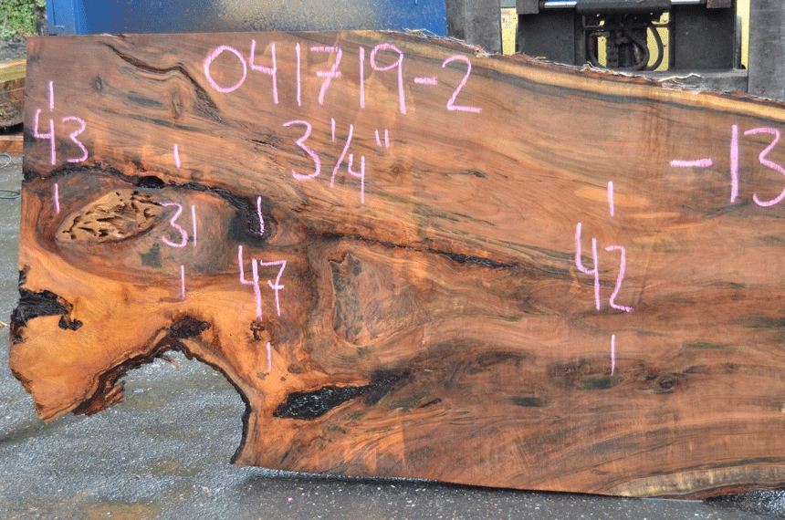 Cracks top left, Large rotted knot left, Bark inclusion left, Rot bottom left, Small sound knots