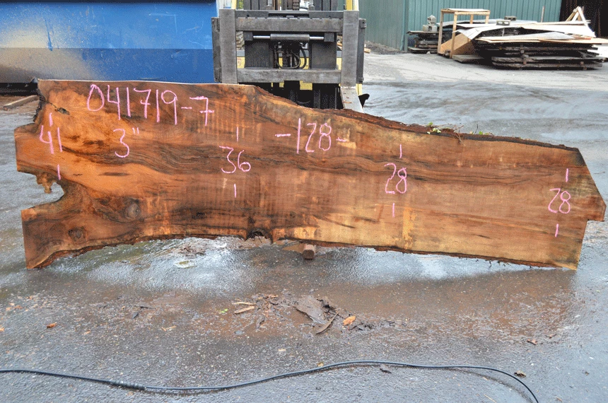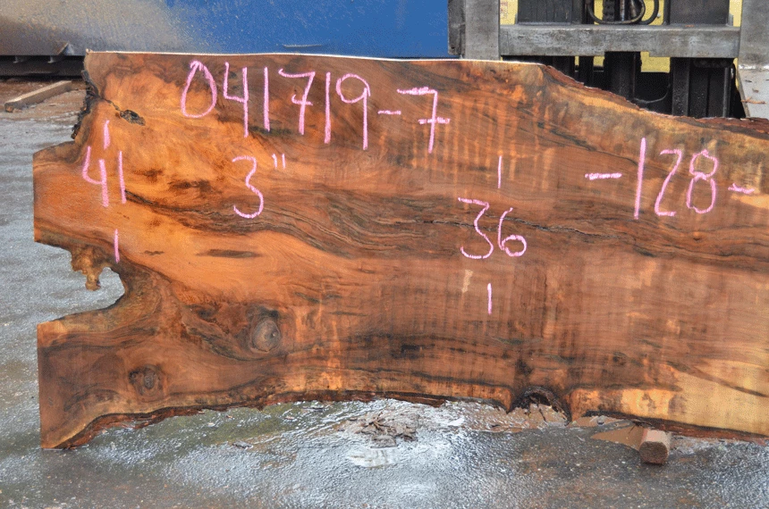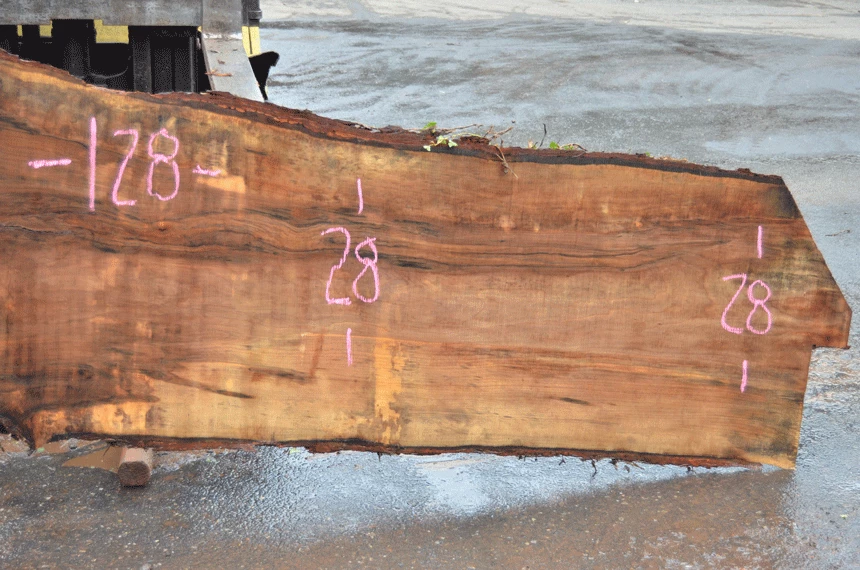 Rot top left, Partially cracked knots left, Bark inclusions top left, Cracks center, Light figure, Jacket cut