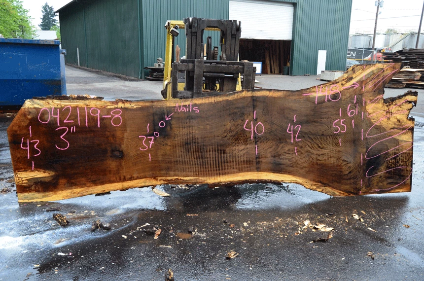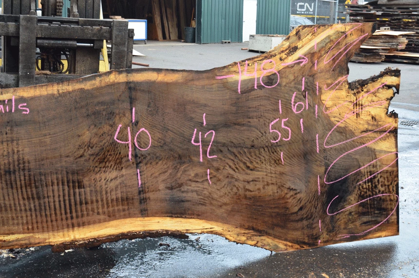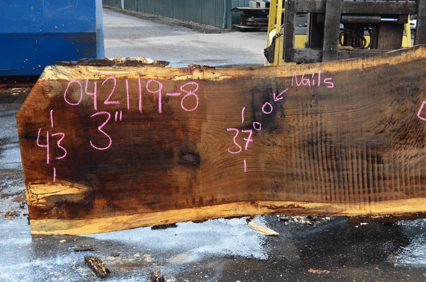 Soft knot left, Nails, Small cracks, Small bark inclusions right