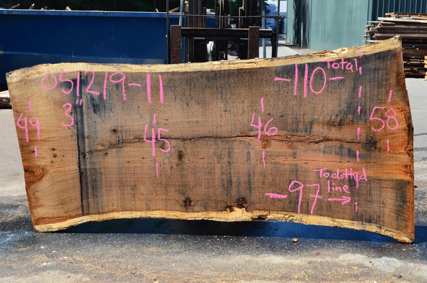 Cracks, Rot on sapwood edges, Small bark inclusions, Small sound knots left, Nail top left, Rot spot far right end, Slight blade wandering