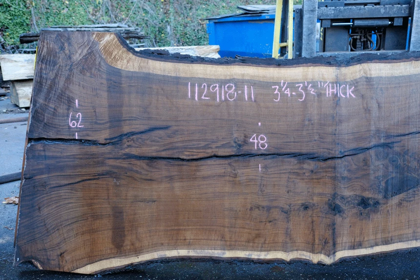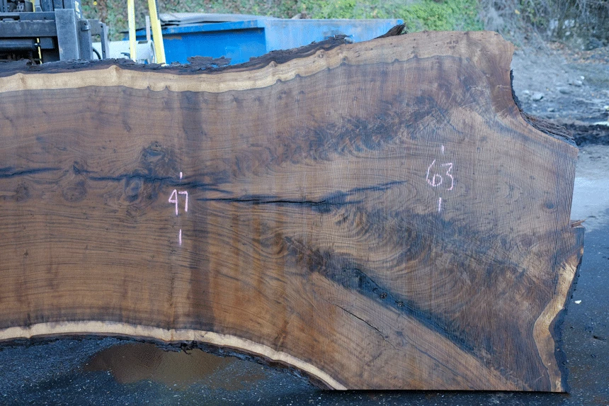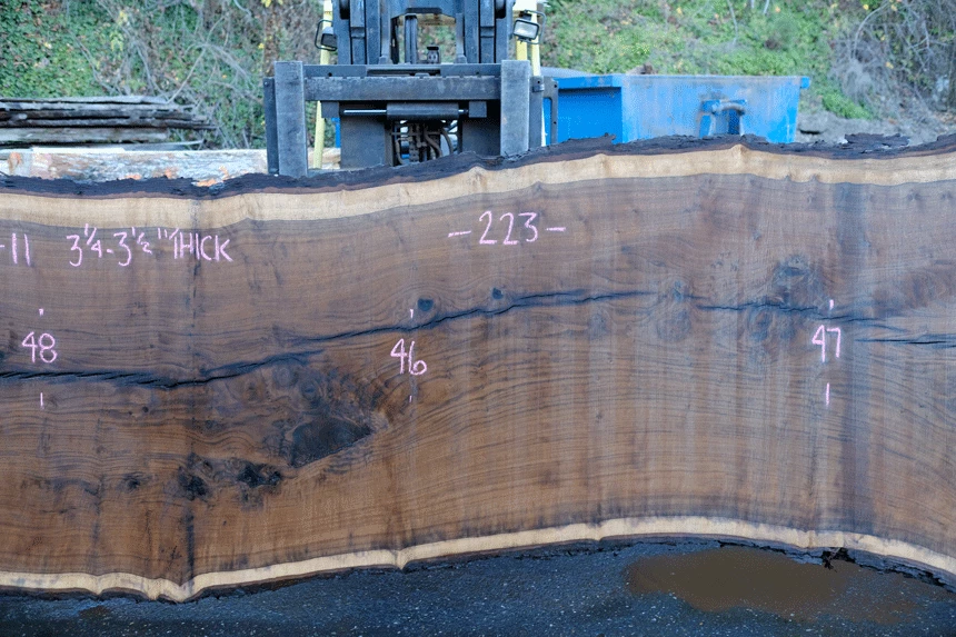 Long cracks through center, Surface cracks, Blade wandering on back, Figure, Bark inclusion bottom right