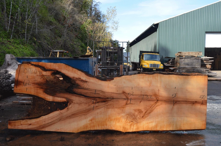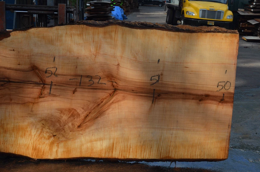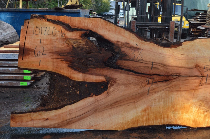 Large bark inclusions top left, Crack through center, Knots, Light figure