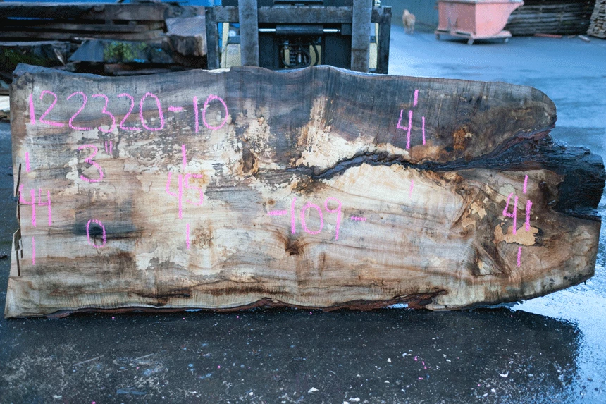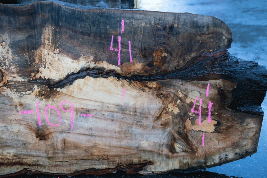 Light surface spalting, Small cracks far left end, Nail visible left, Small bark inclusions, Large bark inclusion center and right