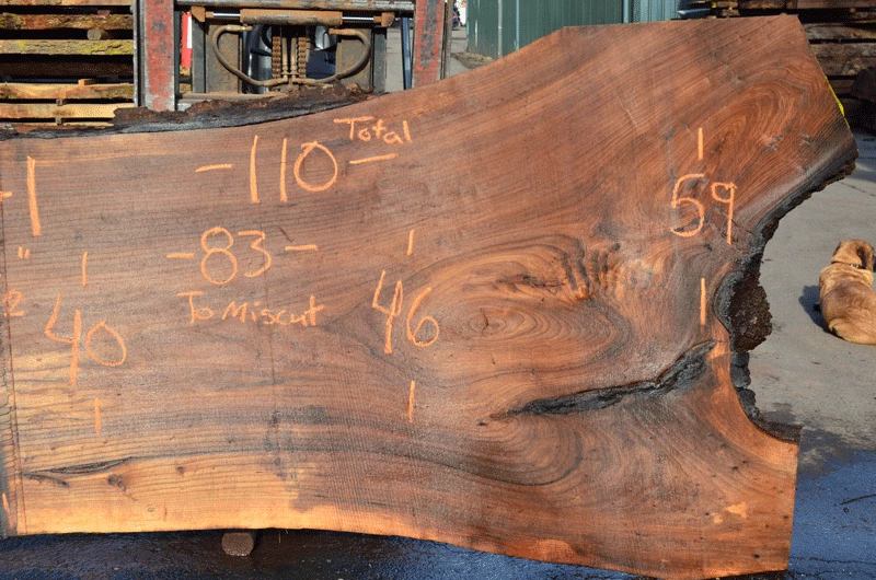 Miscut, Bark inclusions along bottom, Cracked knots right, Light figure right