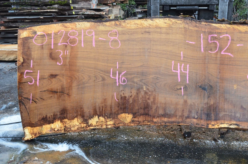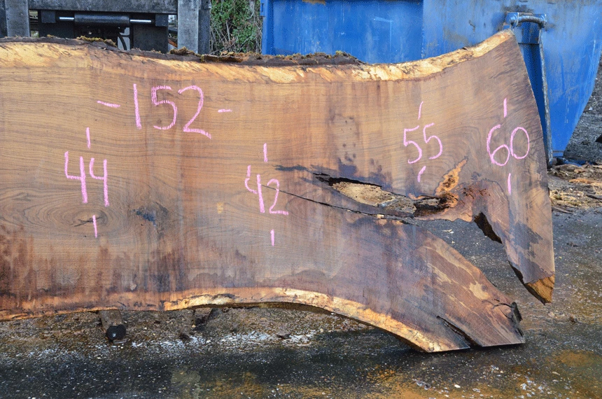 Cracks left, cracked knot center, Small bark inclusion center, Cracks and rot right