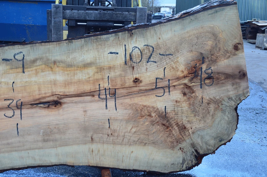 Rot spot top left, Cracks along center, Small bark inclusions, Rot spot right, Figure