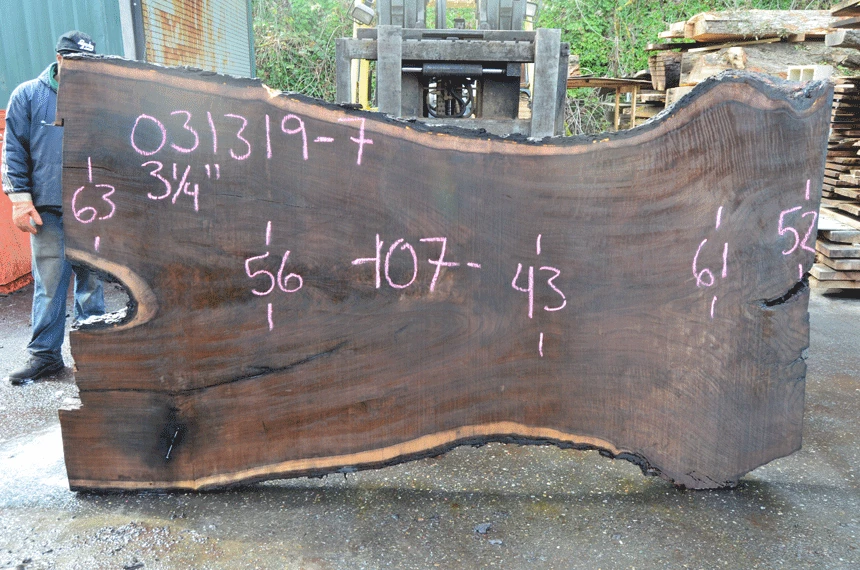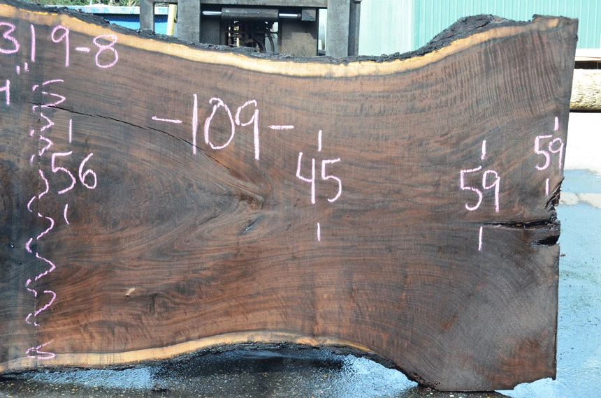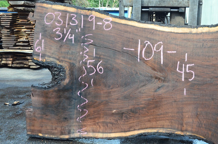 Cracks left, Sound knots, Nail bottom left, Slight blade wandering 3.25″+, Feather crotch, Figure