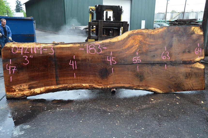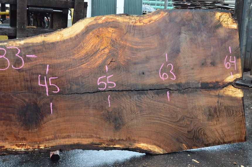Crack left end, Rot spot top right, Cracked knot right of center, Soft knots right, Crack through center