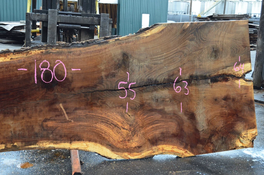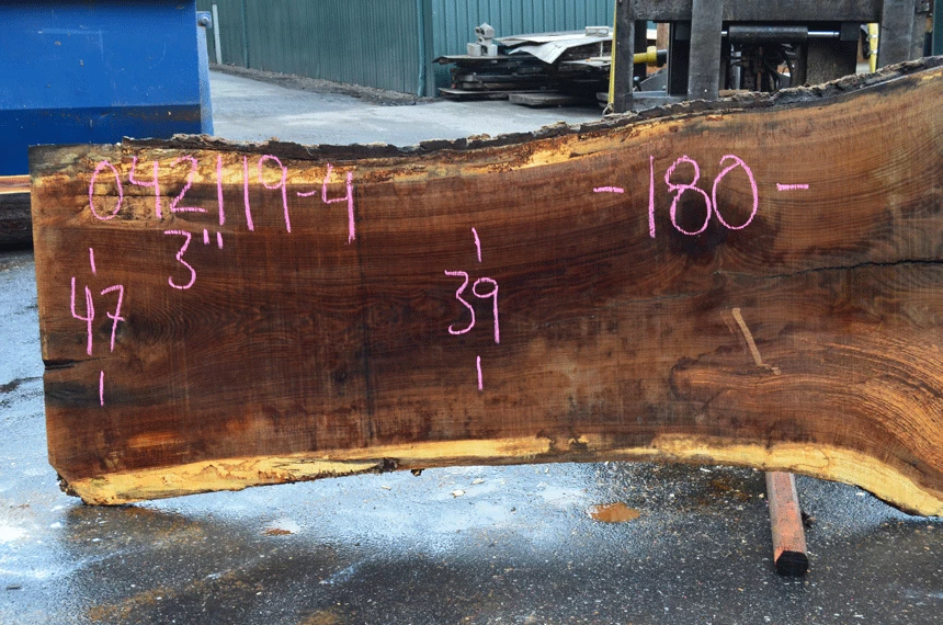 Small cracks left end, Soft knots, Rot spot bottom right of center, Bark inclusions and crack center and right, Small rot spot top right