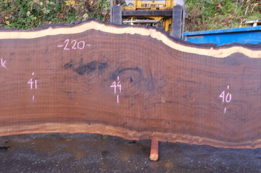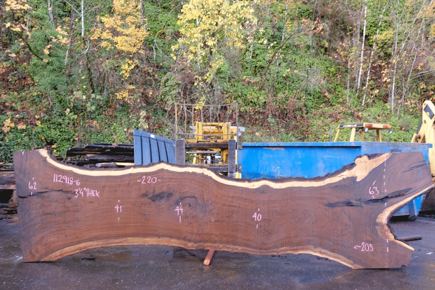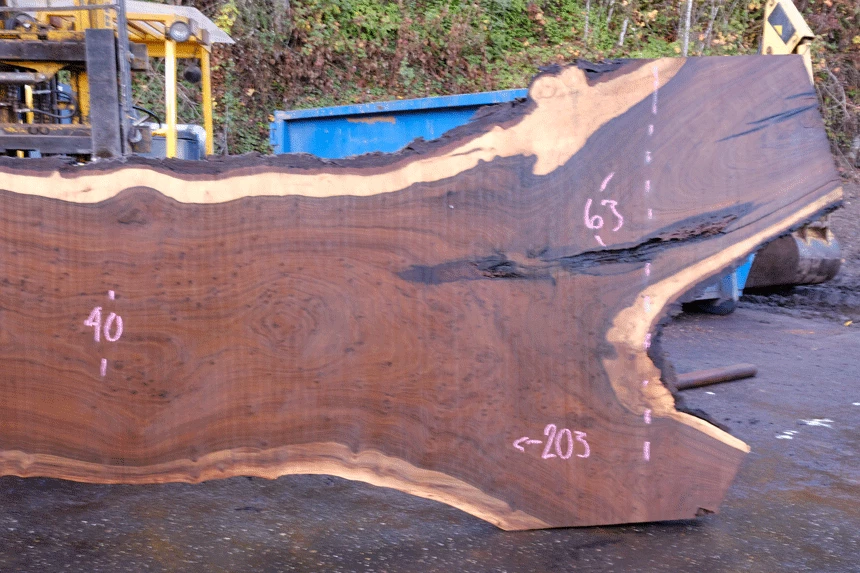 203″ to dotted line, Large cracks on each end, Rotted bark inclusion, Cracked knot, Long bark inclusion top right