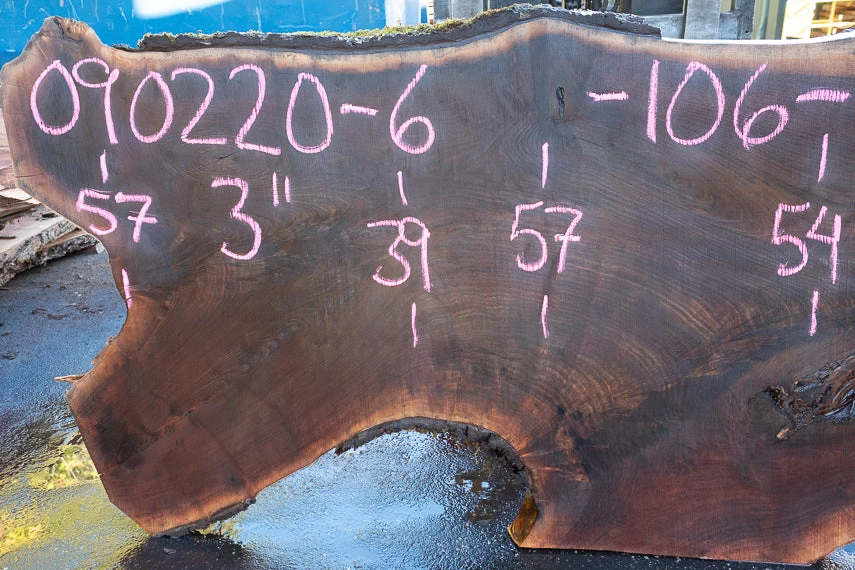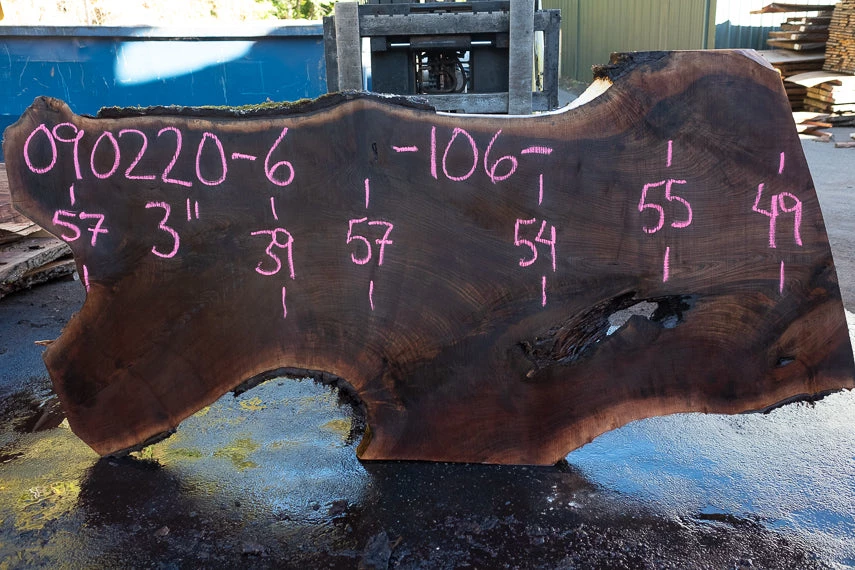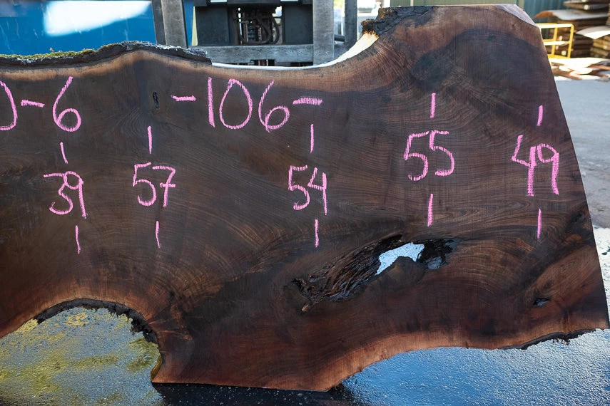 Large sound knots with small cracks, , Small rot spot, Rot hole right, Small bark inclusion top left corner, Light figure, Feather crotch