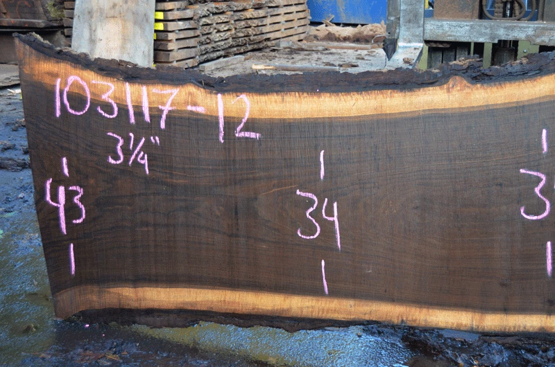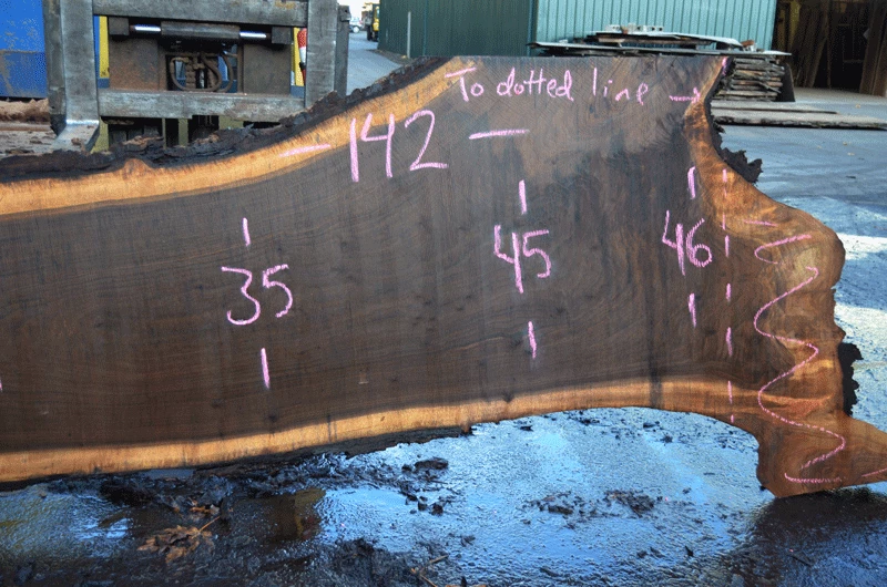 Small sound knots center and right, Partially cracked knot top right, thin sapwood right of dotted line, Light figure