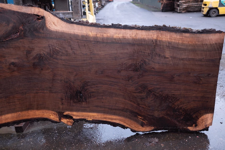 Sound knots, Large rot hole left, Small rot holes, Bark inclusions, Small crack bottom left, Small crack top, Light figure