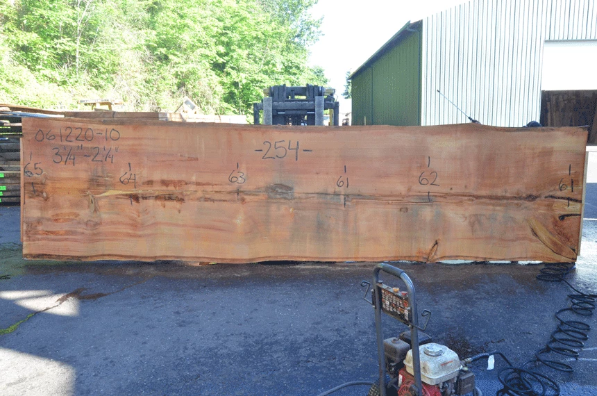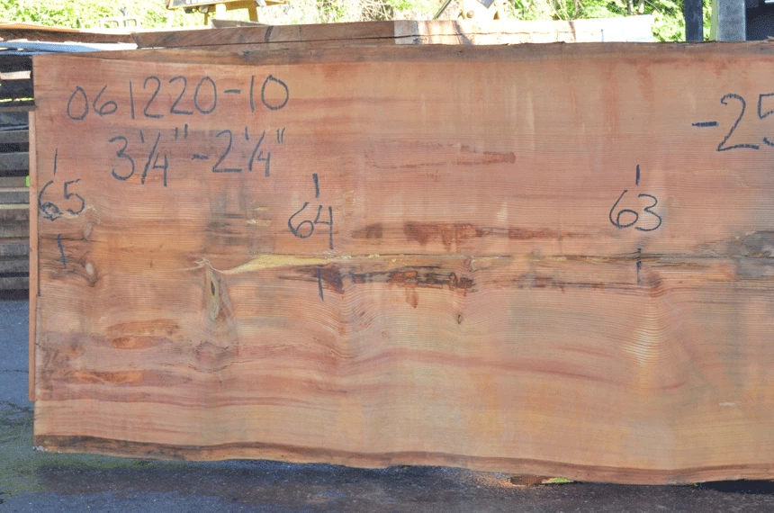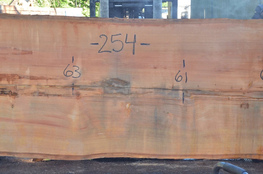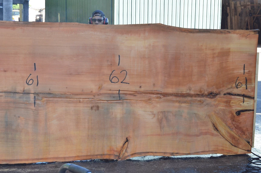 Sound knots, Cracks along center – stabilized, Blade wandering, Rot spots, Bark inclusions right, Metal staining