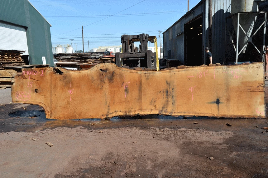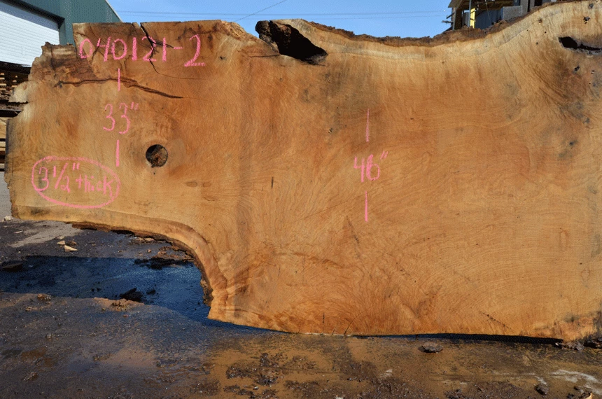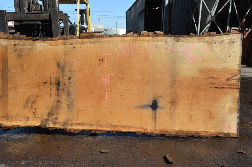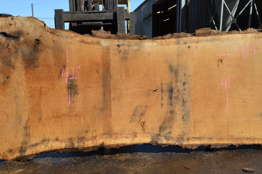 Bark inclusion top left, Crack left end, rotted knots, Large end check right, Metal stain