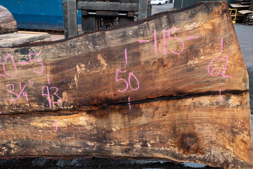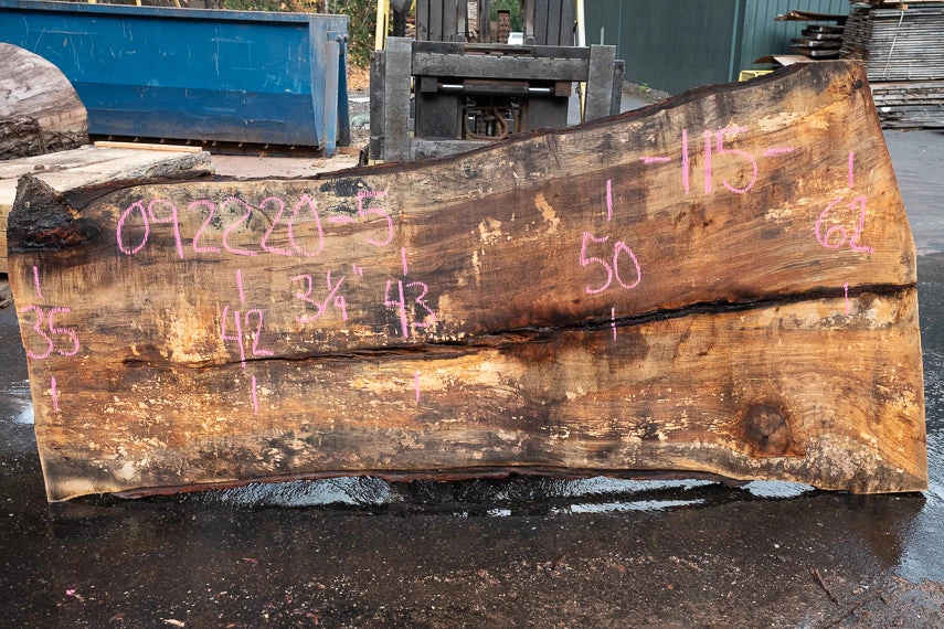 Crack through center – stabilized, Bark inclusions along crack, Soft knot bottom right